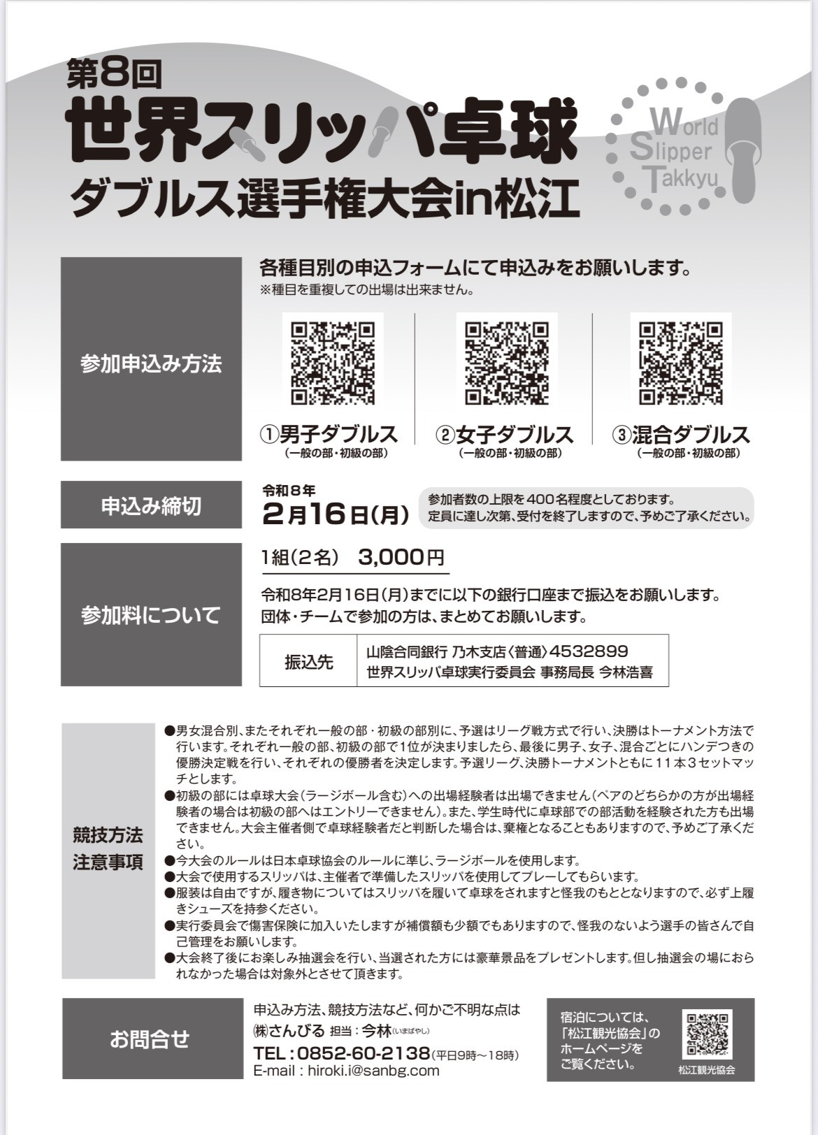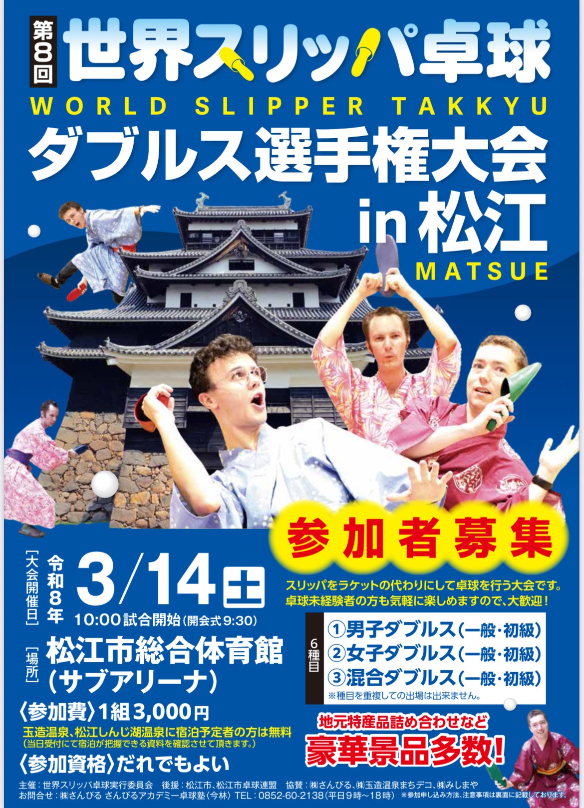 令和8年3月14日(日)に松江市総合体育館(サブアリーナ)において、「第8回世界スリッパ卓球ダブルス選手権大会in松江」が開催されます。
